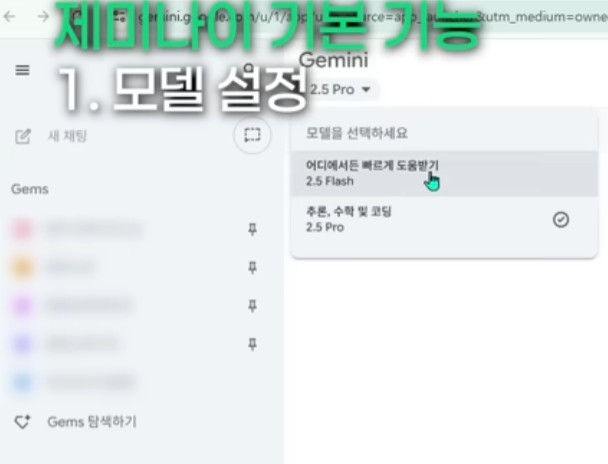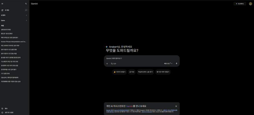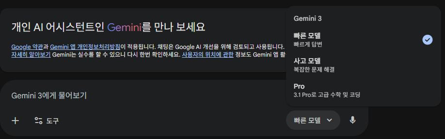 이전처럼 좌측 상단 Gemini 이름 아래가 아니라 질문하는 창에서 선택 가능한 것 같다.