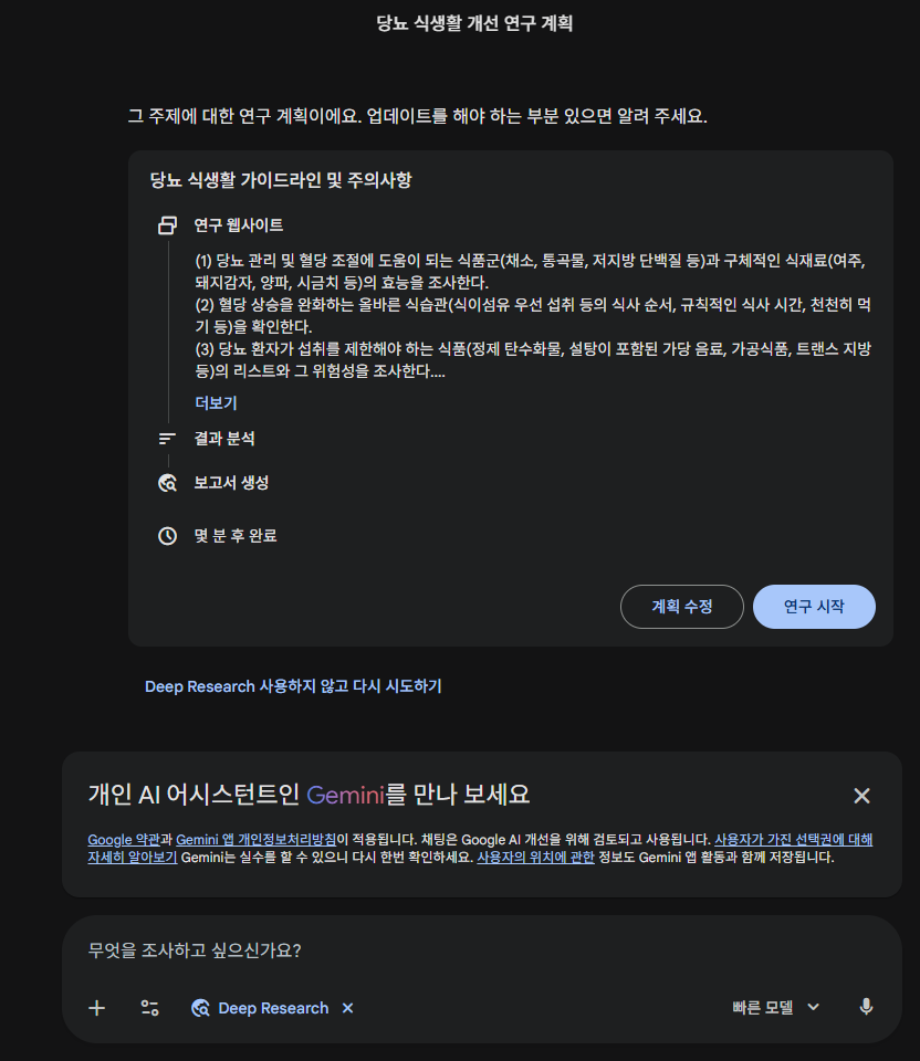 채팅창에서 도구 부분을 누르면 질문하는 모드를 딥 리서치로 바꿔야 하는듯 하다.
