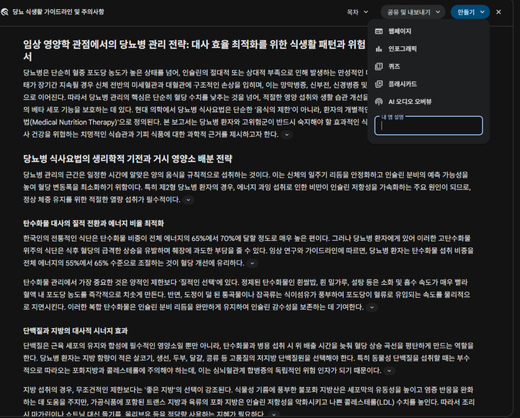 우측 상단에 만들기를 눌러보면 이 조사한 자료를 기반으로 여러가지 결과물을 만들 수 있는 것 같다.